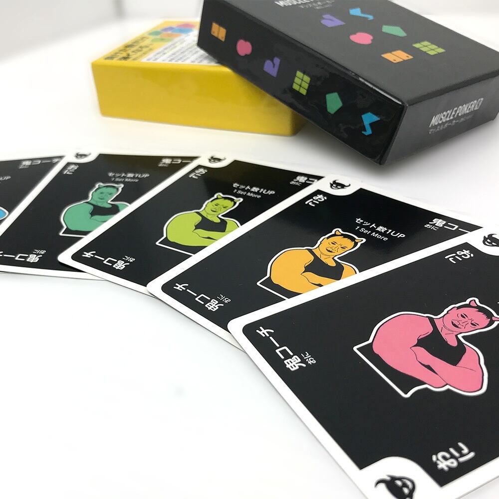 腕トレ、胸トレ、腹トレ、背中トレ、尻トレ、脚トレの全6部位を押しつけ合い「3枚同じ部位のカードを押しつけられる」、「6種類の部位を揃える」、「手札が出せなくなる」の条件を満たすと負けとなり、カードに記された筋トレ種目をエンジョイすることができます。
